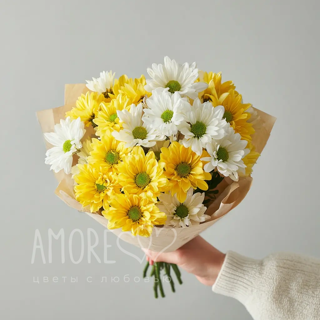 Компактный, но очень выразительный. Хризантемы словно светятся изнутри, превращая небольшой букет в настоящий акцент настроения.