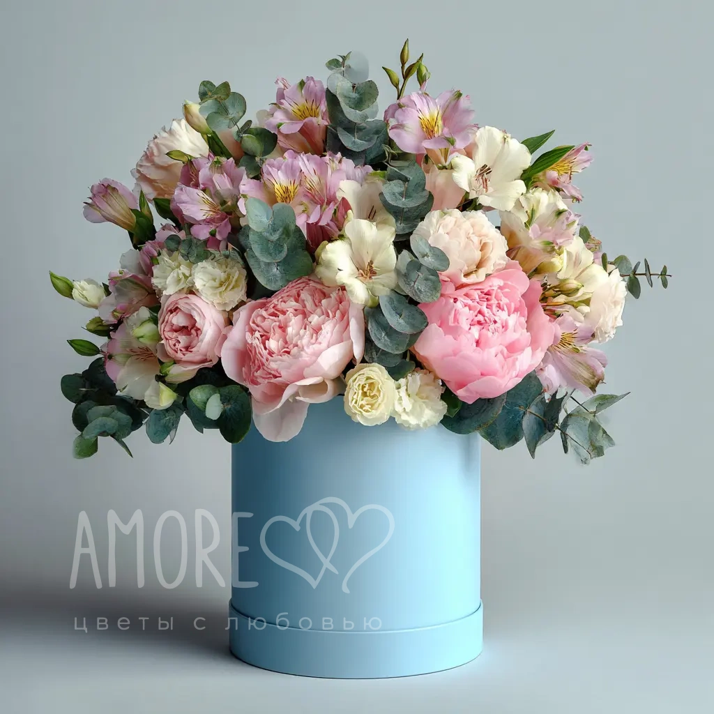 Свежие пионы, альстромерия и эвкалипт создают ощущение летнего утра. Ароматная и легкая композиция для уютных моментов и особых случаев.