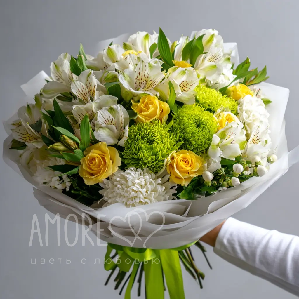 Композиция, как летняя песня — наполнена мягкими красками, теплом и светом. Альстромерии добавляют воздушности и утончённости. Универсальное решение для поздравления женщины или девушки.