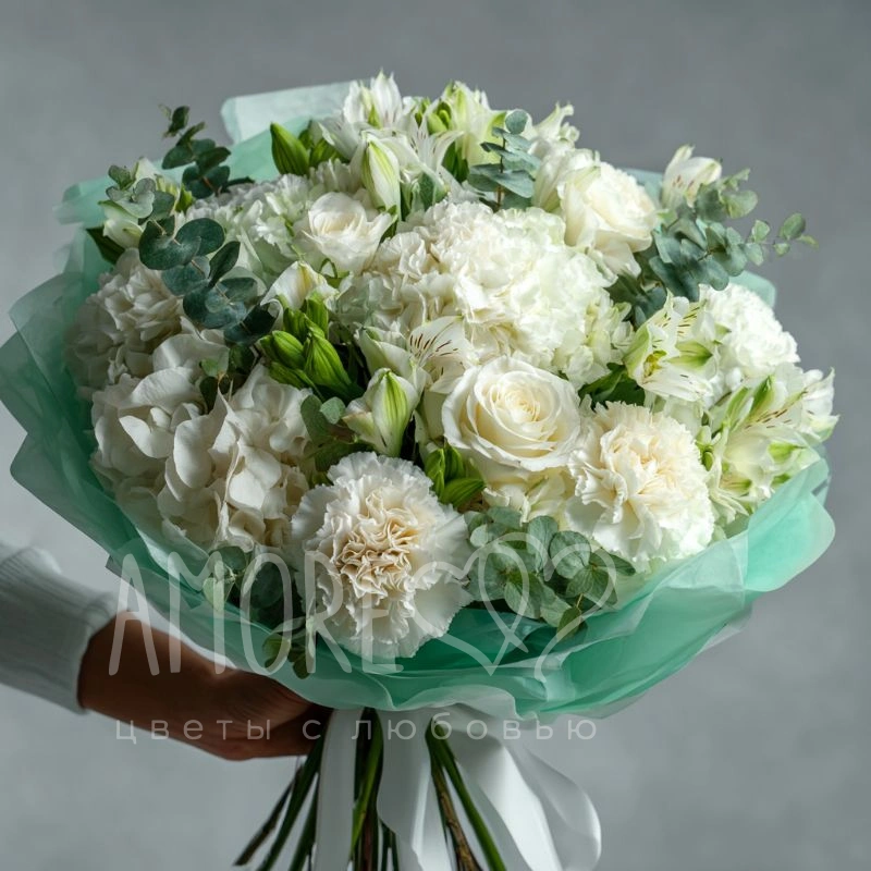 Лёгкий воздушный букет с нотками свежести создаёт ощущение прохлады. Отлично подойдёт для свадьбы, юбилея и дня рождения.