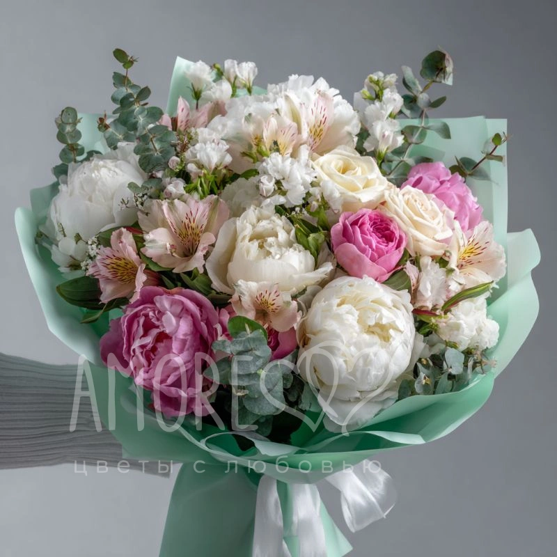 Воздушный букет из нежнейших пионов, словно облако в руках. Лёгкий, романтичный букет, который подходит для комплимента, свидания или фотосессии. Отличный вариант для поклонников минимализма и эстетики.