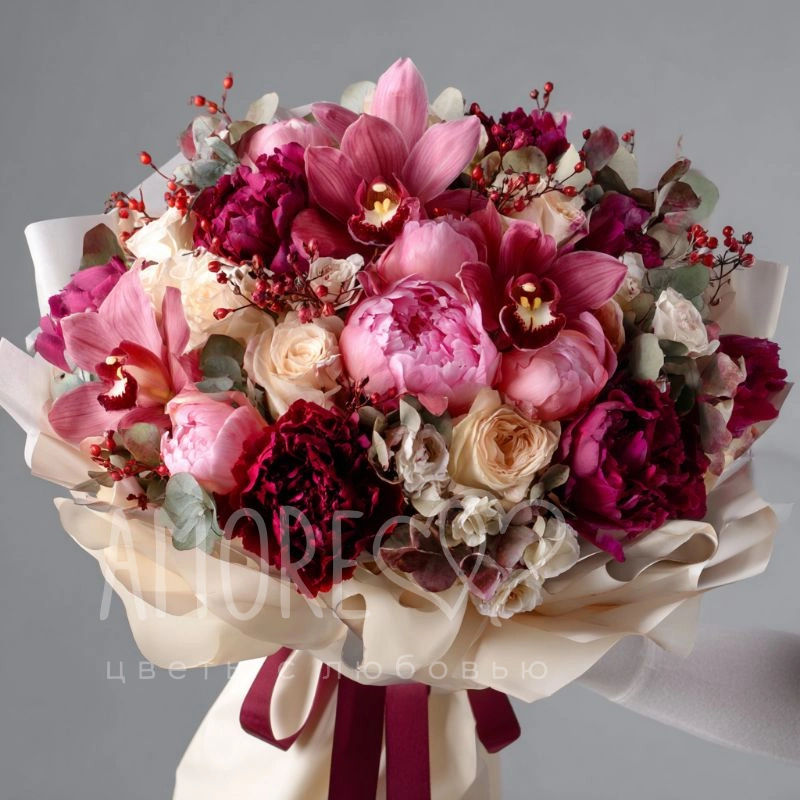 Рубиновый блеск и розовый румянец переплетаются в роскошной композиции, дарящей тепло и страсть. Подарок, который запоминается надолго.