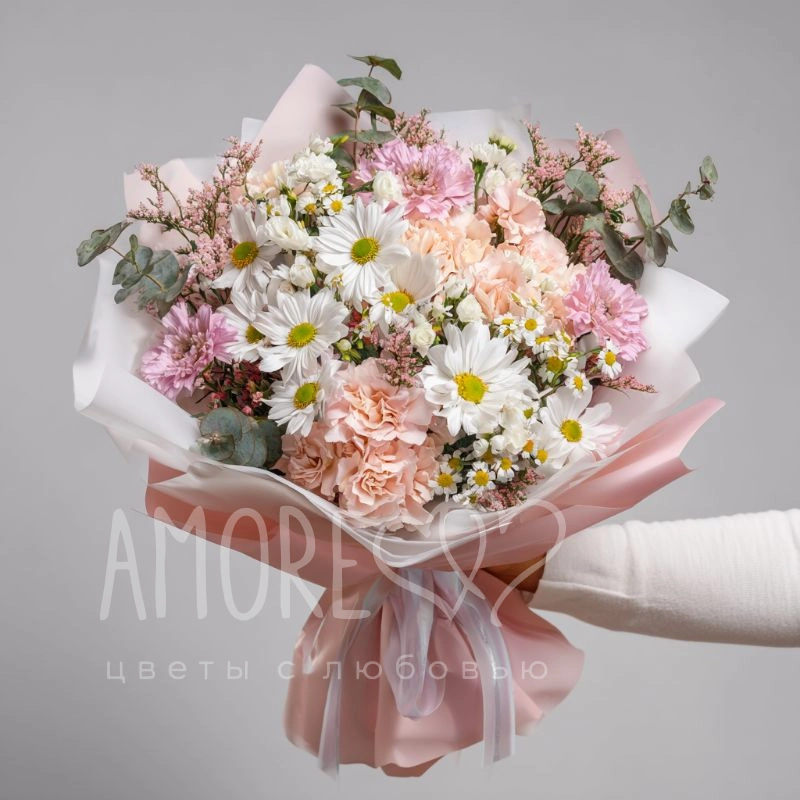 Нежная и пёстрая композиция в стиле «деревенской романтики». Белые хризантемы напоминают о летнем луге, свободе и лёгкости. Отличный выбор для душевных поздравлений и близких людей.