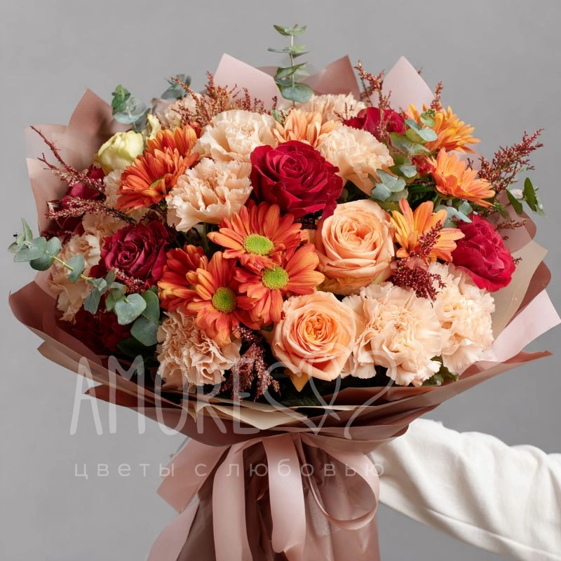 Как разноцветные листья, кружатся оттенки хризантем в этом букете. Каждый цвет — эмоция, каждое соцветие — послание. Букет идеально подойдёт для выразительных подарков в осенний период.