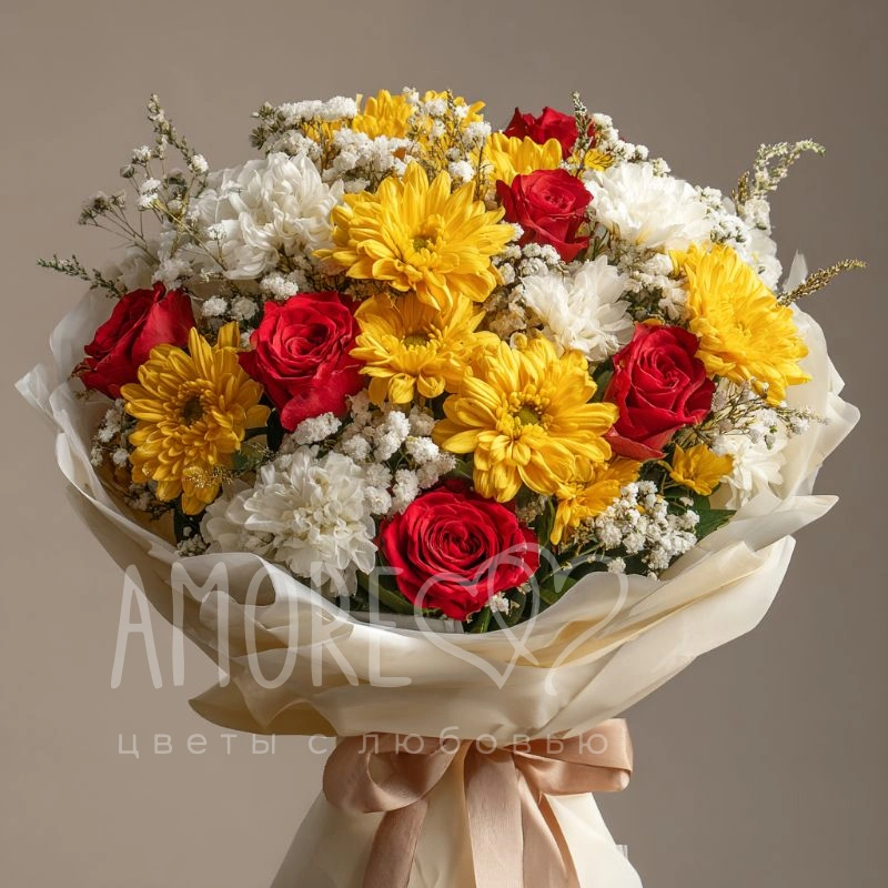 Букет, в котором встречаются солнечный свет и прохлада осени. Хризантемы подчёркивают тёплый посыл, а оформление делает его актуальным как для женщины, так и для мужчины.