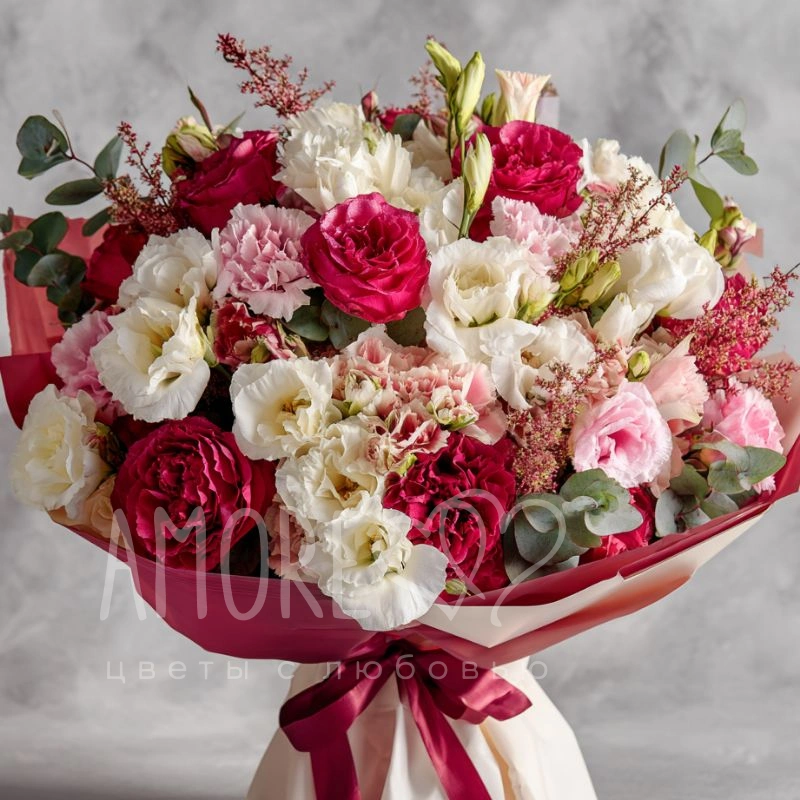 Нежный акцент из изящных бутонов эустомы — свежесть и аромат в каждой детали. Идеально подойдёт для поздравления коллеги, подруги или любимой женщины. Сдержанно, но выразительно.