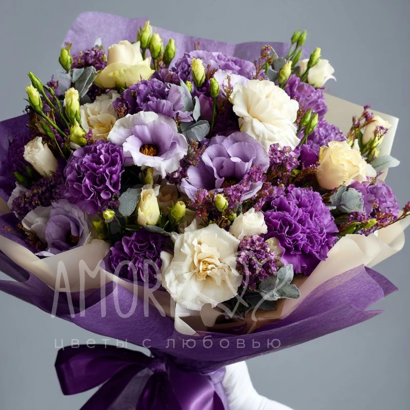 Лёгкий и воздушный букет, в котором переплетаются хрупкие эустомы и пышные гвоздики. Их сиреневые оттенки создают ощущение волшебства и нежности. Отличный выбор для признания в чувствах или создания праздничного настроения.