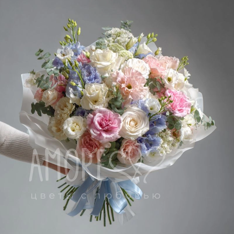 Свежий и чувственный букет с эустомами пастельных оттенков. Он словно вдох новизны — лёгкий, весенний, чистый. Прекрасен как для романтичного повода, так и для спонтанного знака внимания.