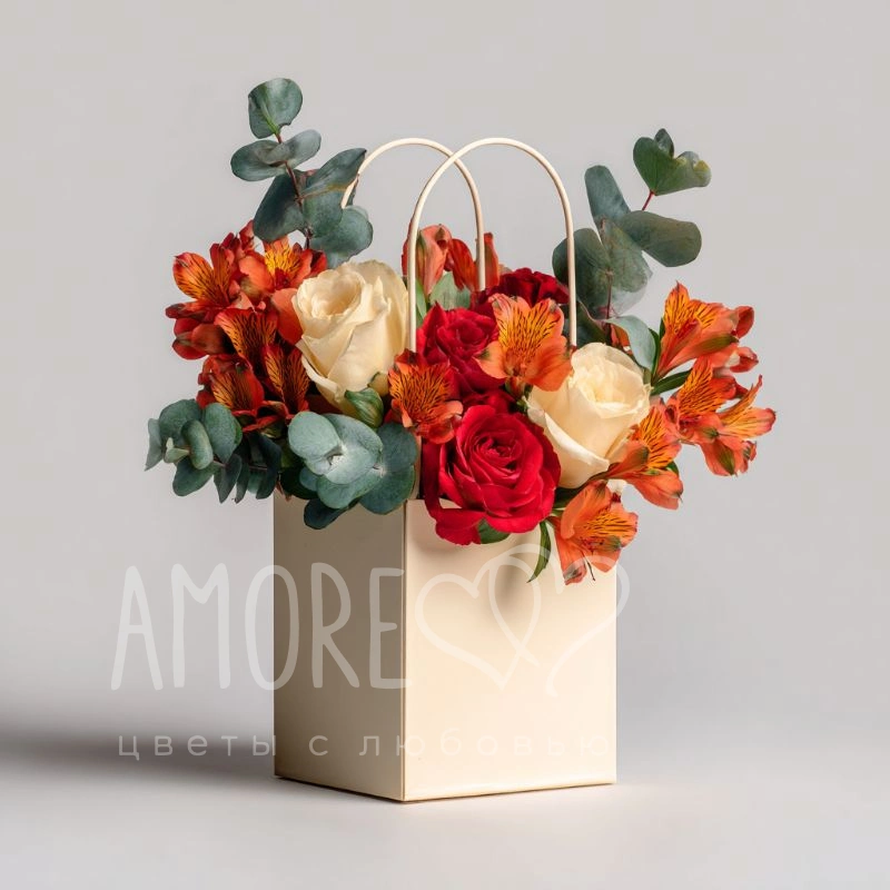 Современный взгляд на букет. Цветы, оформленные в стильную сумку, — это тренд для мегаполиса, символ быстрой красоты и продуманного стиля.
