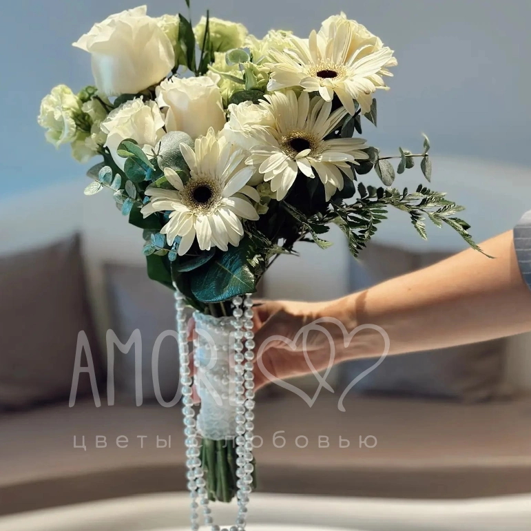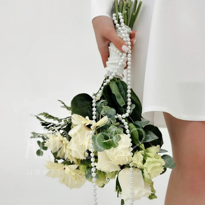Нежный букет в кремовых тонах, сочетающий элегантные розы и воздушные герберы, излучает чистоту и изящество. Зелень эвкалипта и папоротника придает ему естественную свежесть, а жемчужная нить, обвивающая стебли, добавляет нотку роскоши. Этот букет станет идеальным дополнением к образу невесты или элегантным акцентом любого торжества.