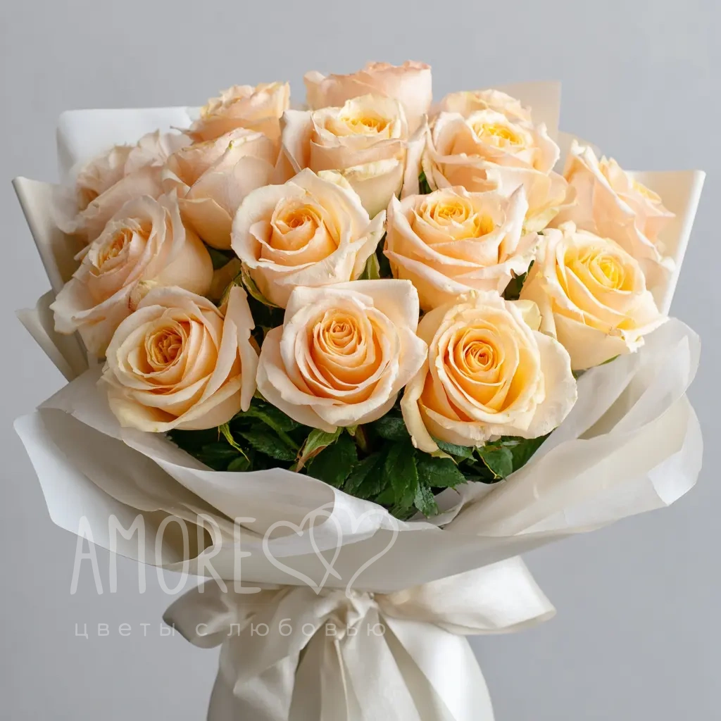 Мягкий, пастельный букет из 15 персиковых эквадорских роз подойдёт для изысканного подарка на день рождения, юбилей или свадебную годовщину. Персиковый цвет — символ благодарности и тёплого отношения.